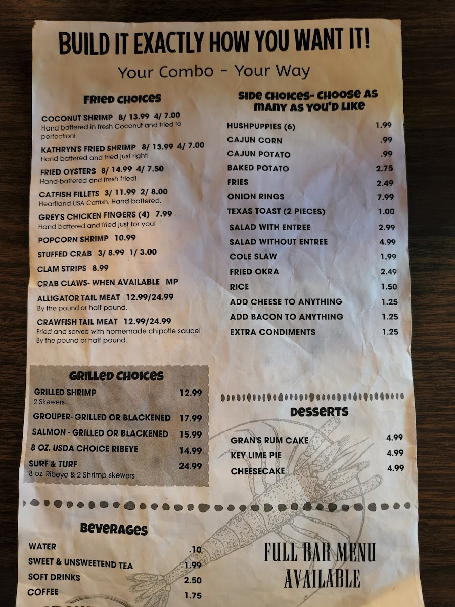 You’ll find standout dishes like crab legs and oysters on the half shell, perfect for enjoying alongside a cold margarita or local beer. The boiled crawfish and shrimp bring a taste of coastal tradition, while the fried green tomatoes and alligator appetizer add a touch of regional character.